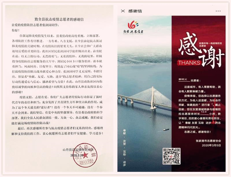 近日,yl23455永利集团收到来自甘肃省张掖市山丹县清泉镇、张家港市志愿者协会的感谢信,对学院参与抗“疫”志愿服务的志愿者们在抗疫期间的突出表现给予了高度评价和衷心的感谢。