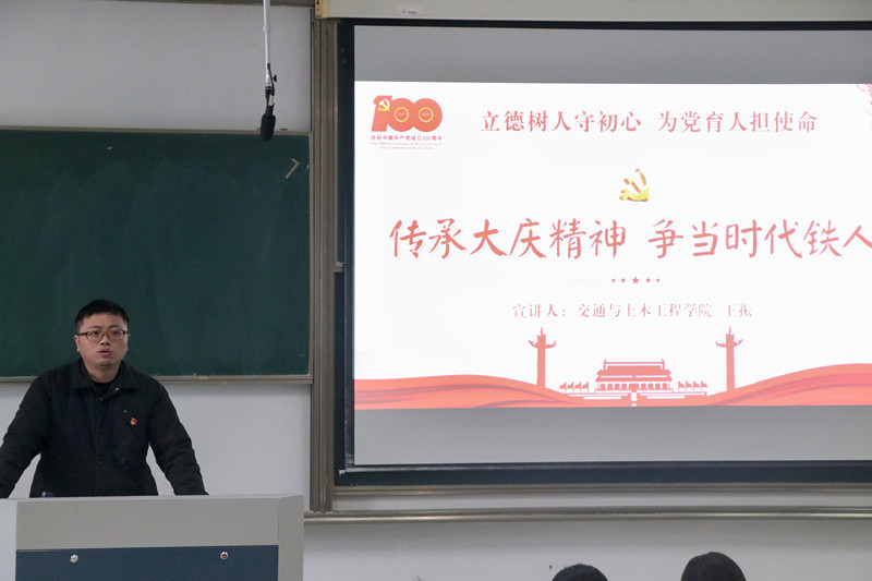 学院辅导员王振以《传承大庆精神,争当时代铁人》为主题,向学员们阐述了大庆精神的形成、时代含义及其文化传承。他结合生活实例生动形象地向学员剖析了大庆精神内涵,即为国争光、为民族争气的爱国精神,独立自主、自力更生的艰苦创业精神,讲求科学、三老四严的求实精神,胸怀全局、为国分忧的奉献精神。
